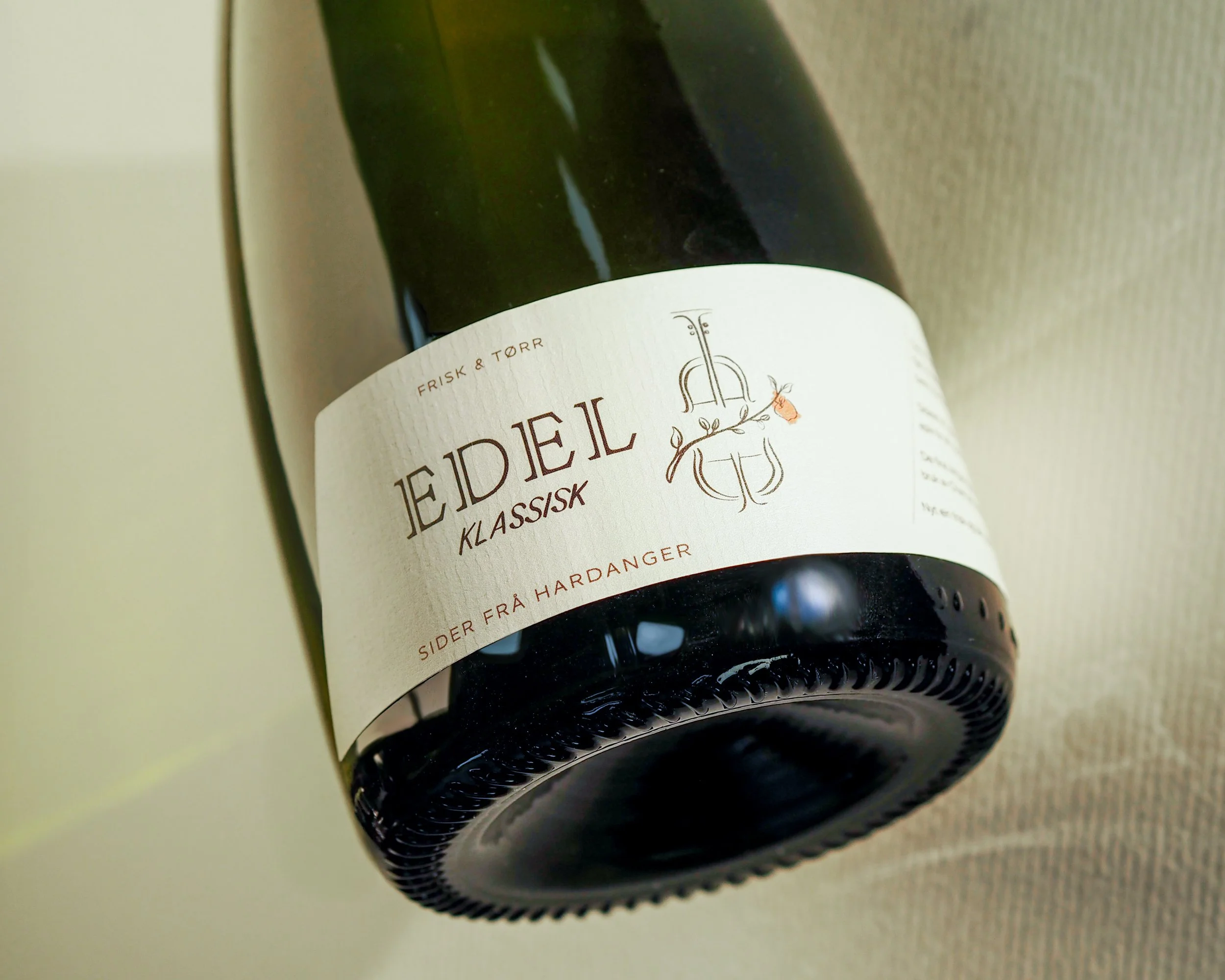 Løsningen ble en stilisert hardingfele – et symbol på norsk håndverkstradisjon – med en eplegren som slynger seg gjennom strengene. Illustrasjonen tilfører etiketten et varmere og mer personlig uttrykk, samtidig som den forankrer sideren i både tradisjon og terroir.